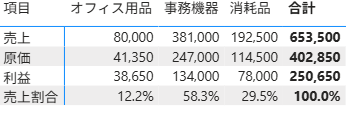 売上テーブル = DATATABLE( "項目", STRING, "SORT", INTEGER, )次に、値として表示したい部分についてDAX式で作成を行います。