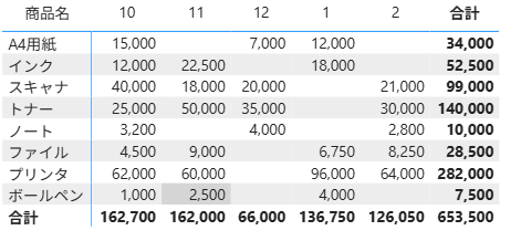 こちらのマトリックスでは、「行」に「商品名」、「列」に「月」、「値」に「売上金額」の合計を当てはめて作成したものとなります。この表を作成することで、特定の月に商品がどのくらい売れており、合計ではいくらの売上となっているのかが一目で分かるようになっています。このように、マトリックスを使用することで様々な切り口からデータを分析することが可能となるのです。