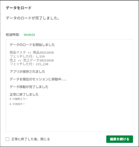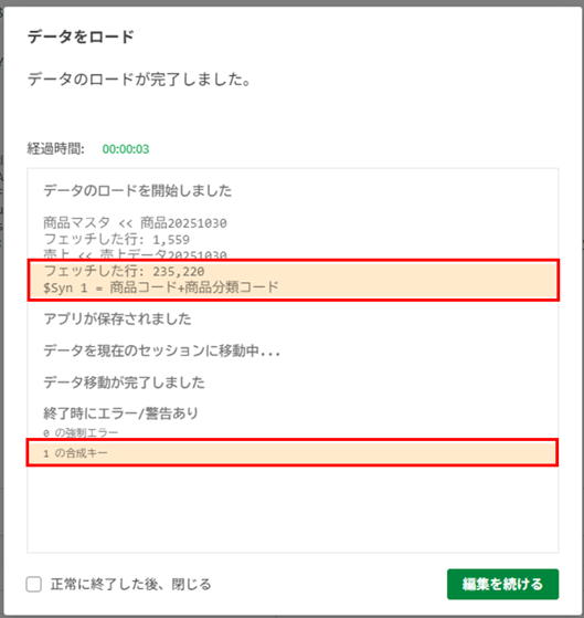 合成キーが作成されている場合、リロードログに$Synテーブルの作成メッセージと合成キーがいくつ作成されているか表示されます。