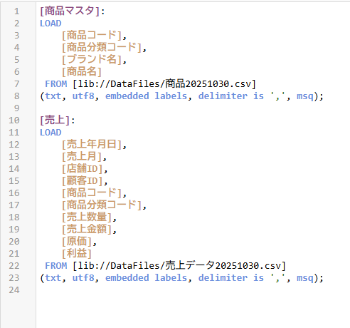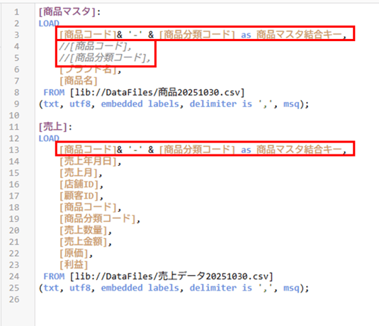 - 作成する「商品マスタ結合キー」に「商品コード」と「商品分類コード」の情報が含まれているため、商品マスタ側の「商品コード」と「商品分類コード」をコメントアウトし削除します。