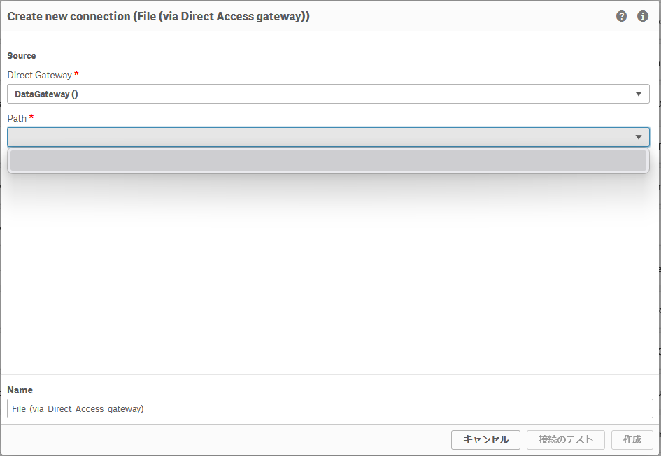 「File(via Direct Access gateway)」を選択して設定すれば良いのではと思うかもしれません。デフォルトの状態でただ「File(via Direct Access gateway)」を選択しただけではファイルパスを選択するPath欄に何も表示されていません。