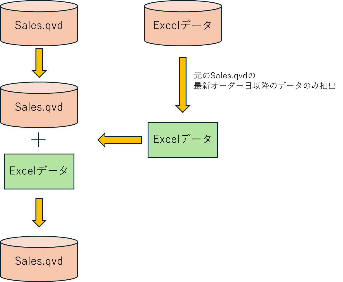 今回は、Sales.qvdに対してSales.qvd内の最新のオーダー日以降のExcelデータを増分ロードを行い、最新データを増分ロードしたSales.qvdに上書きする処理を記載しています。
