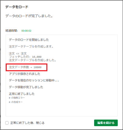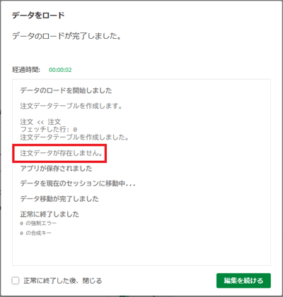 実行中の「データロード進行状況」ウィンドウおよび「ロードログファイル(.log)」に記録されます。