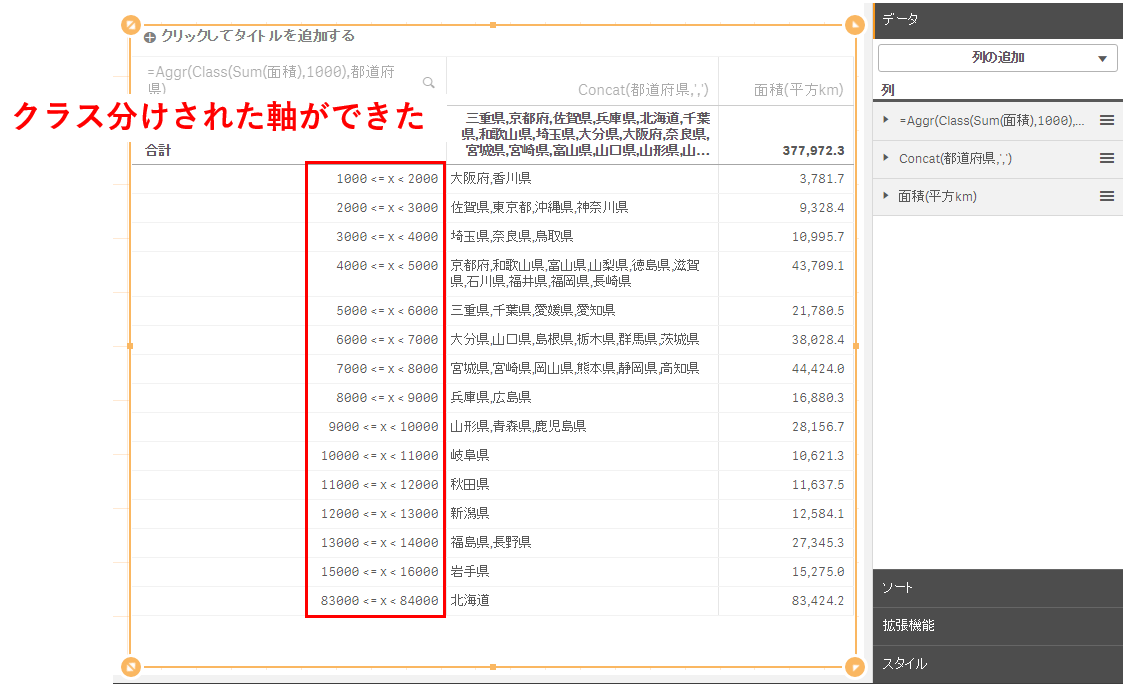Aggr関数・Sum・Class関数を使い、都道府県ごとに集計した面積で1000平方㎢ごとにクラス分けしています。