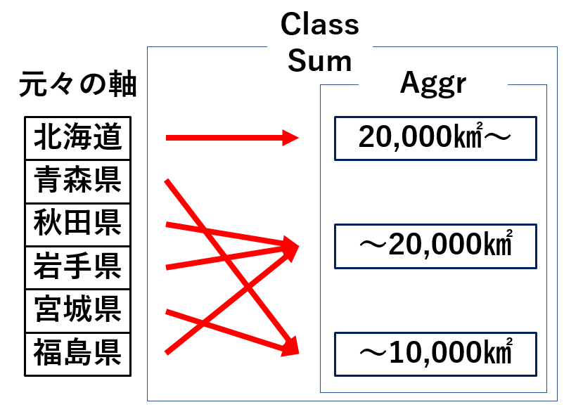 イメージとしては下の図のように「Sum・Class関数でクラス分けする」→「Aggr関数でQlik Senseが認識できる軸として組み立てる」といった感じです。