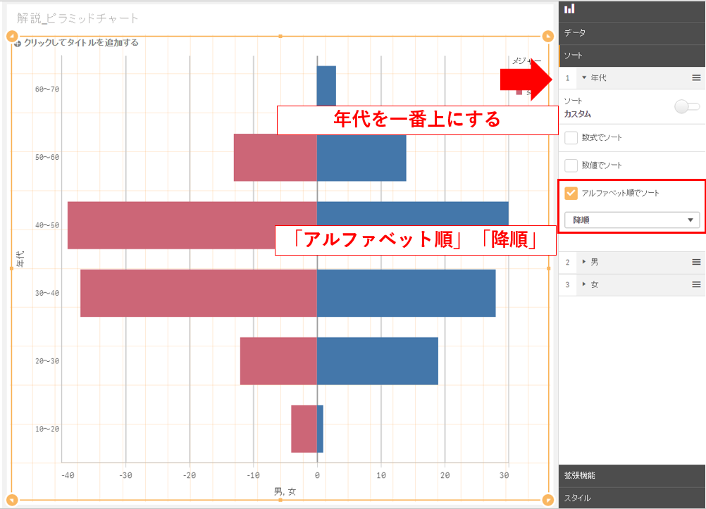 サンプルデータの年齢軸ではチャートが細かくなりすぎるため10歳ごとの年代を軸にします。