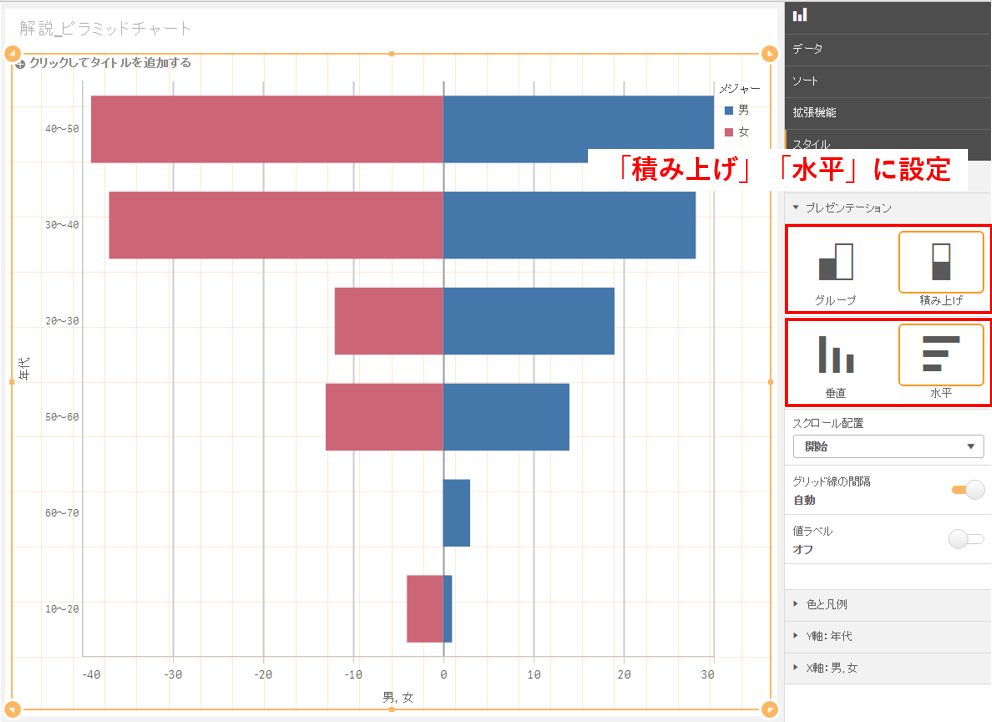 続けて、プレゼンテーション設定で「積み上げ」「水平」を選択しましょう。