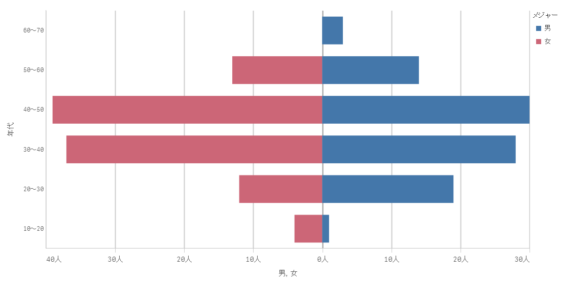 ピラミッドチャートは「年齢」「性別」ごとの人数を可視化する典型的なチャートです。