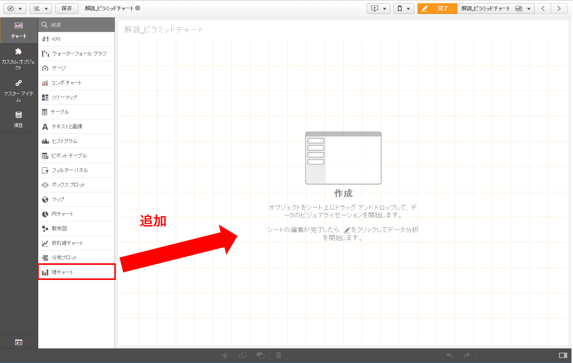 Qlik Senseにデータを取り込んだ後、棒グラフを追加します。