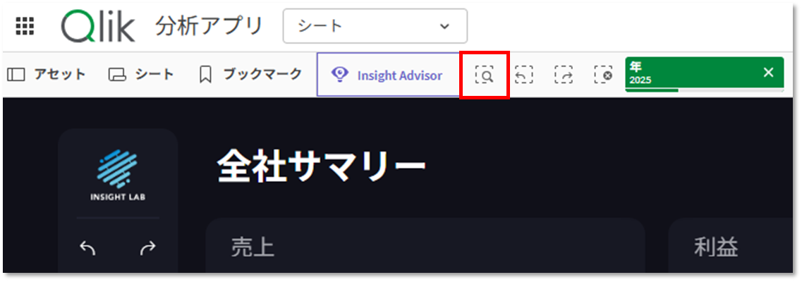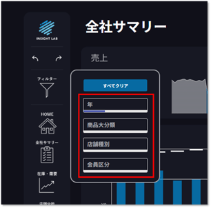特定のグラフやフィルターパネルを探す手間を省き、アプリ全体のデータから関連する項目を瞬時に見つけ出すことができます。