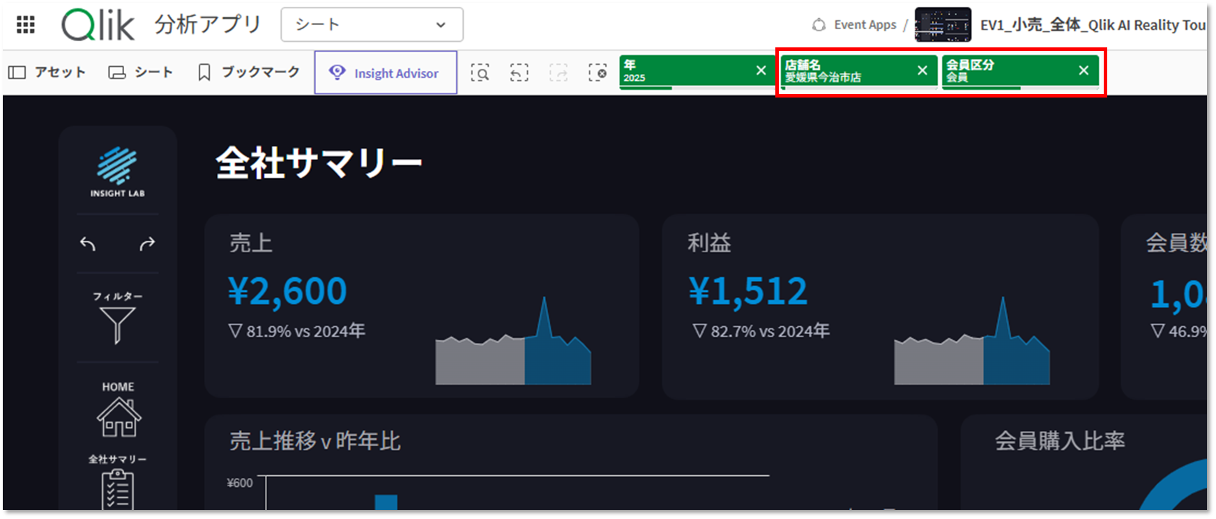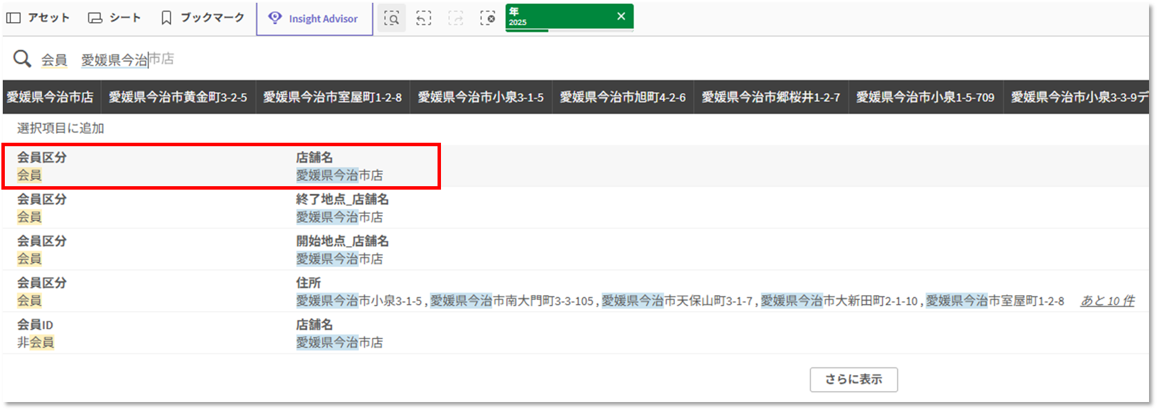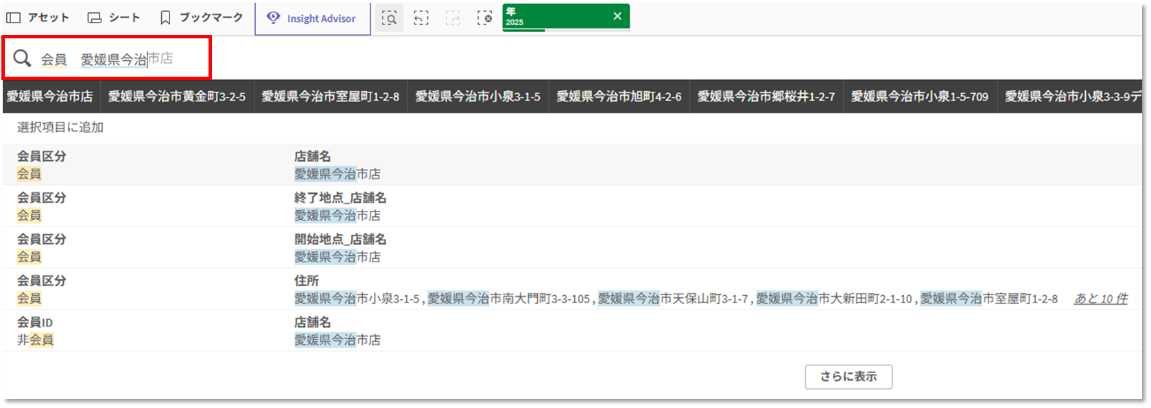 ある小売業界のアプリで、「会員」、「愛媛県今治市店」の関連データを見たいと仮定します。このシートには以下フィルターしかなく、UI上から上記の絞り込みができません。