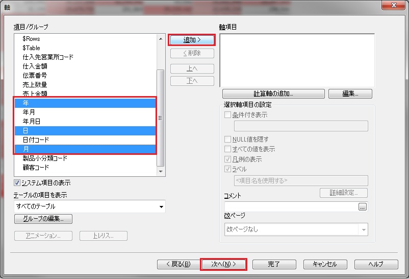 1.【項目/グループ】から『年』、『月』、『日』を選択し、【追加ボタン】を押します。
