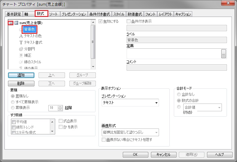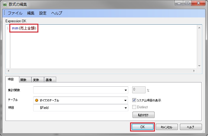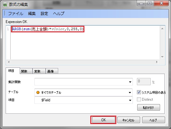 5. 『数式の編集』画面に 『ARGB(sum(売上金額)*vColor,0,255,0)』 を入力します。