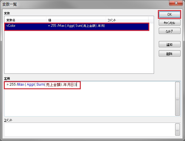 7. 定義に 『= 255 /Max ( Aggr( Sum( 売上金額) ,年月日))』 を入力します。