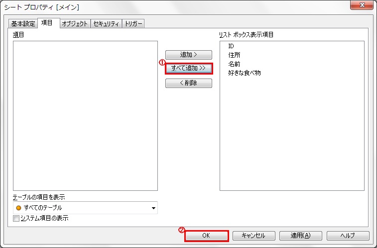 1.【項目】タブをクリックし、【すべて追加】ボタンを押します。