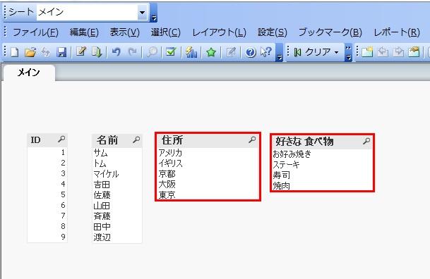 QlikView のメイン画面にcsvファイルのカラムとデータを見ると、住所と好きな食べ物のデータで、重複したデータが統一された事が確認できます。(データが圧縮されています。)