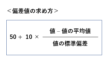 「平均点」「順位」は分かるけど、「偏差値」ってどうやって算出するんだっけ?って思う方もいると思われるので、以下に算出方法を載せておく。「偏差値」は以下のように算出する。
