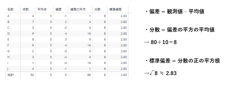 数式を見ると、新たに「標準偏差」というものが登場した。そうすると、次は「標準偏差」ってどうやって算出するんだっけ?という問いが新たに浮上してくる。先ほどのように数式でさらっと記述してもいいのだが、「標準偏差」の算出には「分散」「偏差」についても知っておく必要があるので、ここでまとめて触れておく。