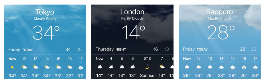 こういった状況なのでiPhoneの天気は良く見るのだが...iPhoneの天気って見ていて楽しいよね。同じような天気でも微妙にバックグラウンドが違ったりする工夫や、綺麗な演出を見るのが好きで、ついついiPhone天気で世界旅行してしまうのはぼくだけでしょうか。