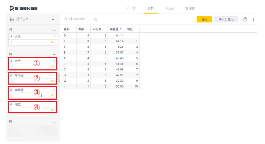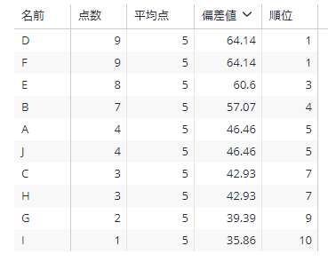 A~Jの10人に対し、10点満点のテストを実施した。その結果を記録した「名前」「点数」のカラムがあるデータ(母集団データ)を使い、「平均点」「偏差値」「順位」の3つを新たに算出したピボットウィジェットを作成する。