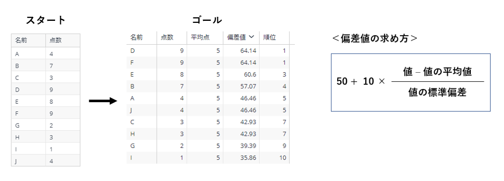 さて、標準偏差についての確認が終わったところで、冒頭で確認したピボットウィジェットの作成に入る。おさらいとして、今回のスタート & ゴールと偏差値の求め方を再掲しておく。