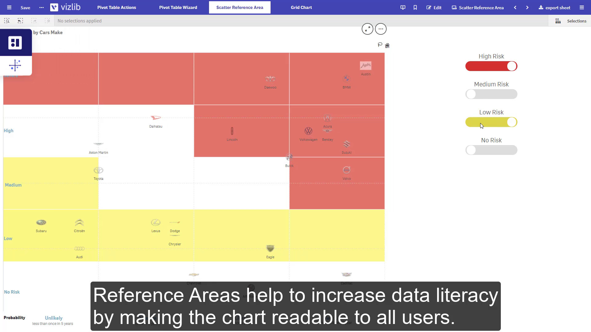 Vizlib散布図の参照領域は、チャートにコンテキストを追加し、ユーザーがチャートを簡単に読み、データを扱う能力を向上させるのに役立ちます。ユーザーのデータリテラシーを向上させるのに最適な方法です。参照領域の条件付き表示により、ユーザーは参照領域の値を高めるデータインサイトに焦点を当てて、散布図の最も重要な領域を簡単にハイライトすることができます。